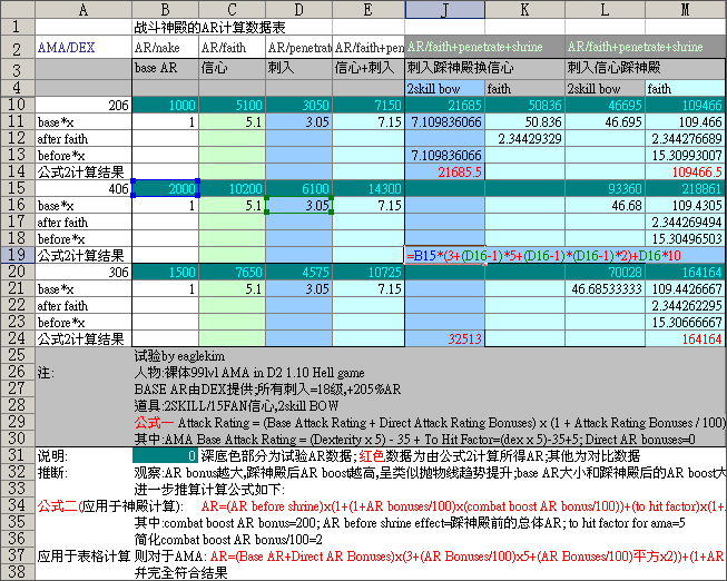 BONUSES值,记录AR的变化....... 并取了踩神殿后换下faith后的不同数据观察.... 观察,发现各参数之间的关系....省去XX字...参考试验表格图.... 然后反推导出AR公式. 在数据上面计算公式与试验所反映数据完全一致(只有在DEX=706的时候出现了错误,暗红色部分。我记得第1个AMA去实验的时候是从大概20KAR提升到300K左右的,后面数据可能自己弄错了,跑来跑去晕,有空再测试下;另外我猜想也可能是706基础DEX超出正常人物的取值范围,也可能被另外修正过),证明无误. 另外关于to