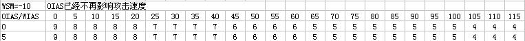 WIAS-WSM决定了此时的攻击速度。由于WIAS过低时SI一般不会达到75上限,故表格中舍去了小于0的数值。